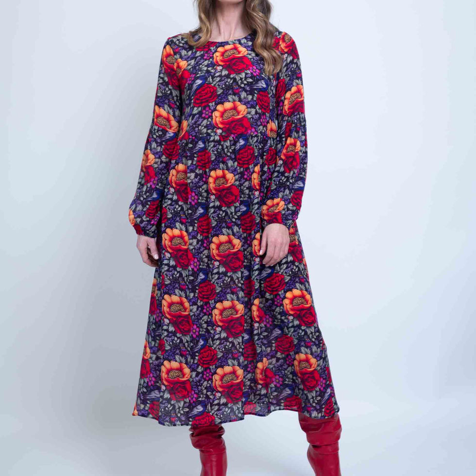 Discover the exquisite Birdsong dress. It is a beautiful one of a kind statement dress, featuring an easy fit bodice, which releases into a graceful gathered skirt. The sleeves are elegantly gathered, with elasticated cuffs Crafted from 100% viscose crepe with the digitally printed signature Birdsong print, this dress epitomizes effortless elegance. For lasting perfection, hand wash in cool water and dry in the shade for longevity. Embrace timeless style and unparalleled quality with this stunning piece. If you don't find your size, message us and we may be able to craft you one in our atelier.